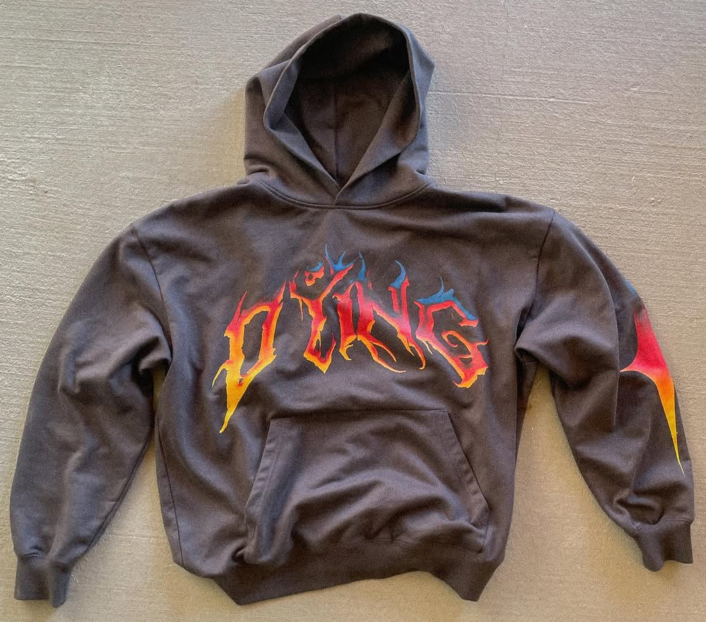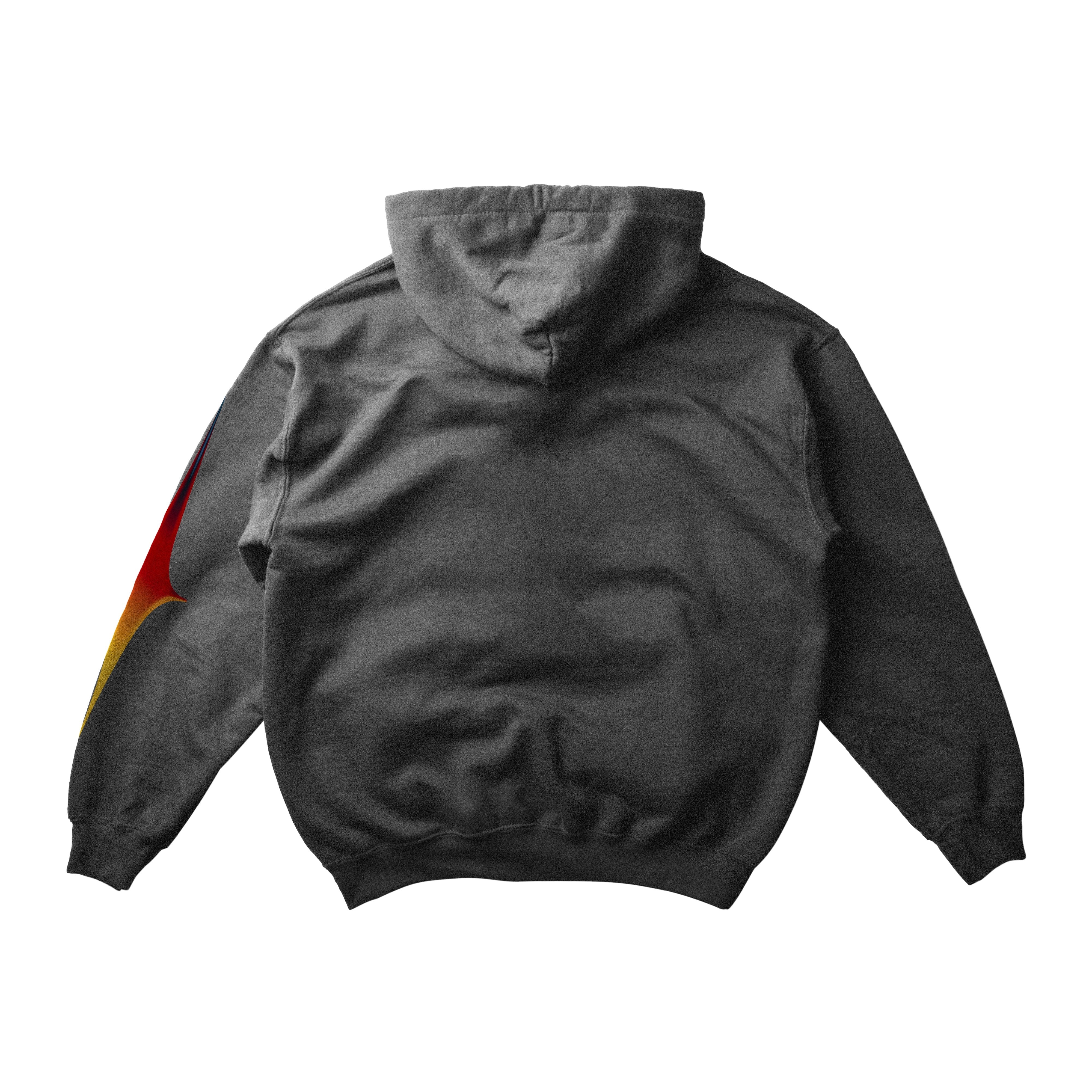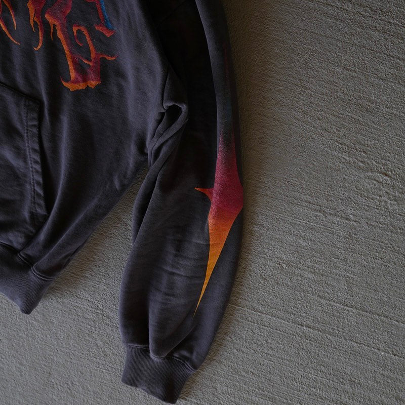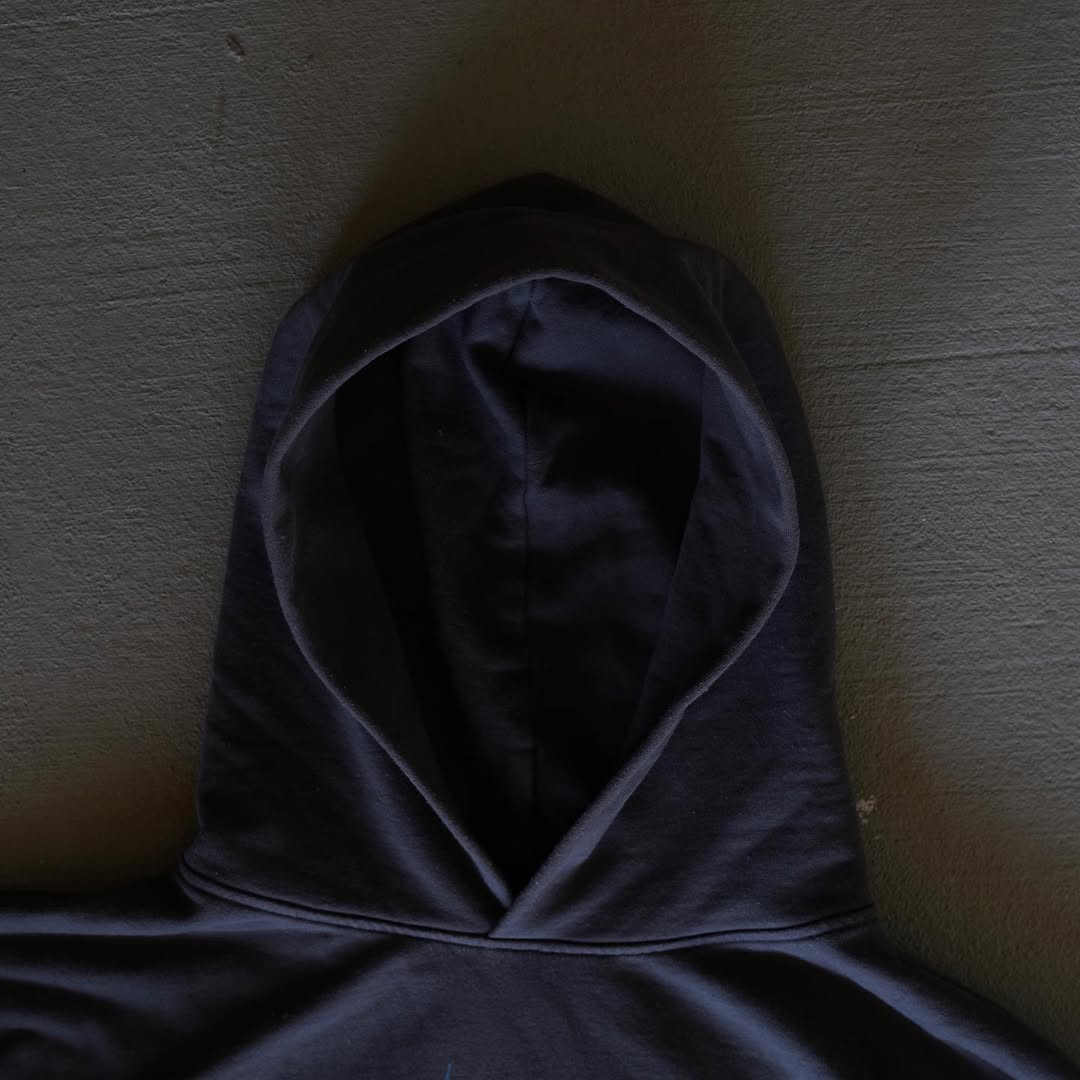-Dark grey washed color way-100% Heavyweight Cotton (420gsm) -digital printed on the left sleeve, middle chest-Double-layered hood