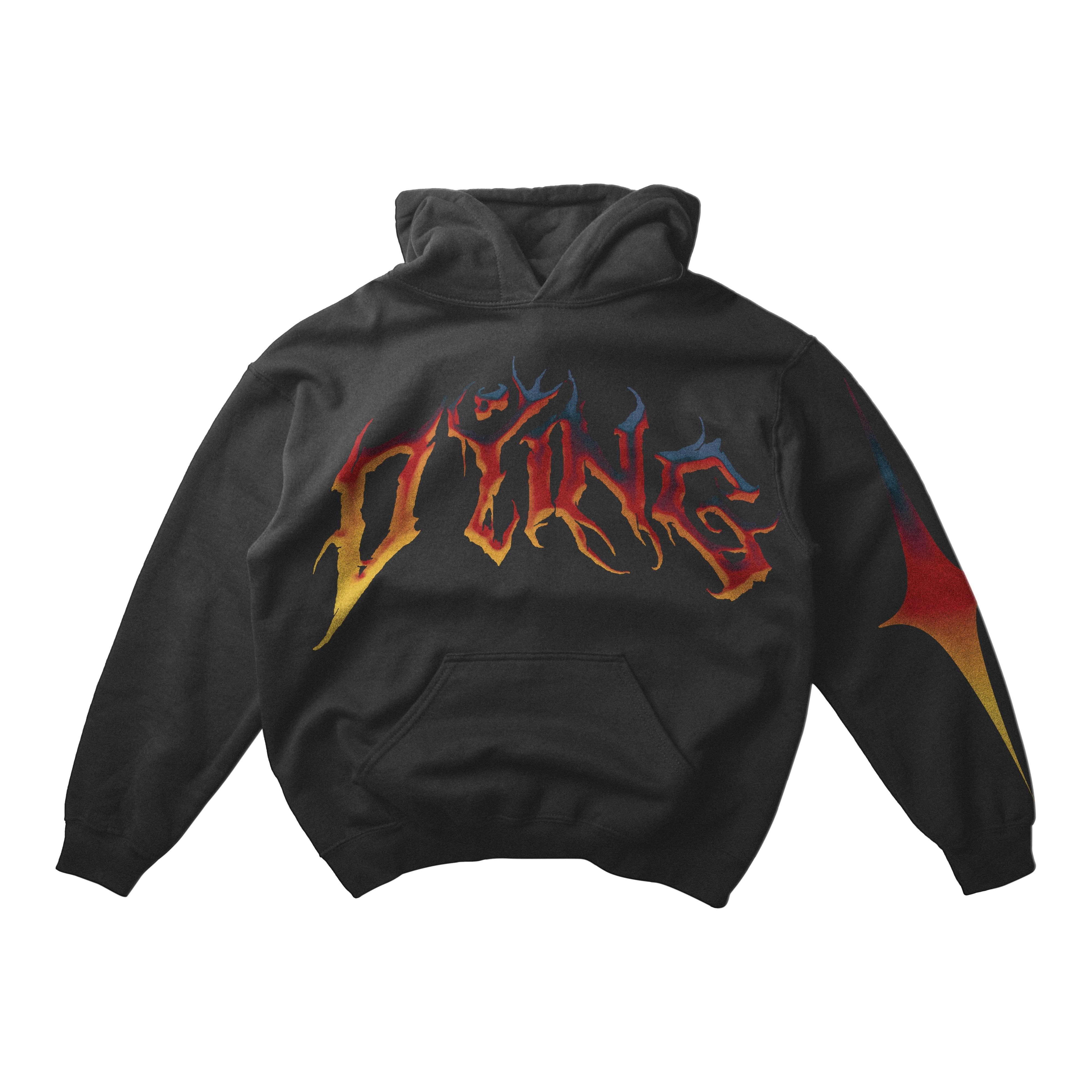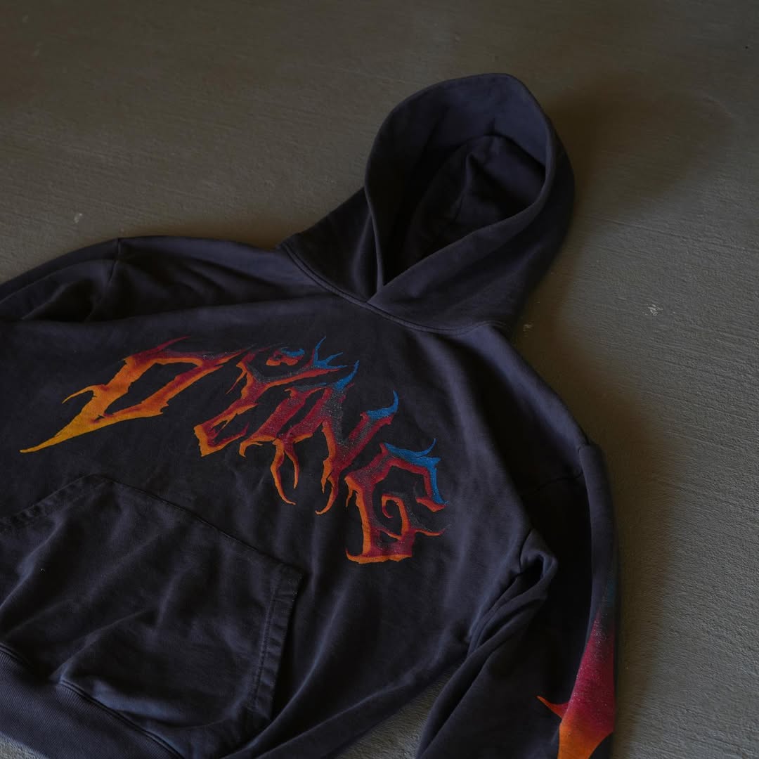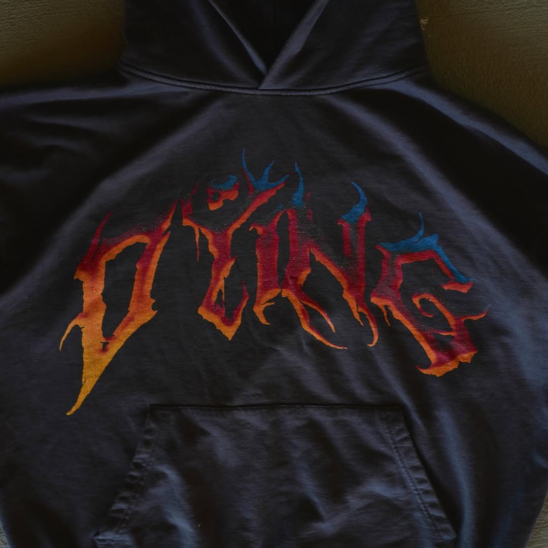 -Dark grey washed color way-100% Heavyweight Cotton (420gsm) -digital printed on the left sleeve, middle chest-Double-layered hood